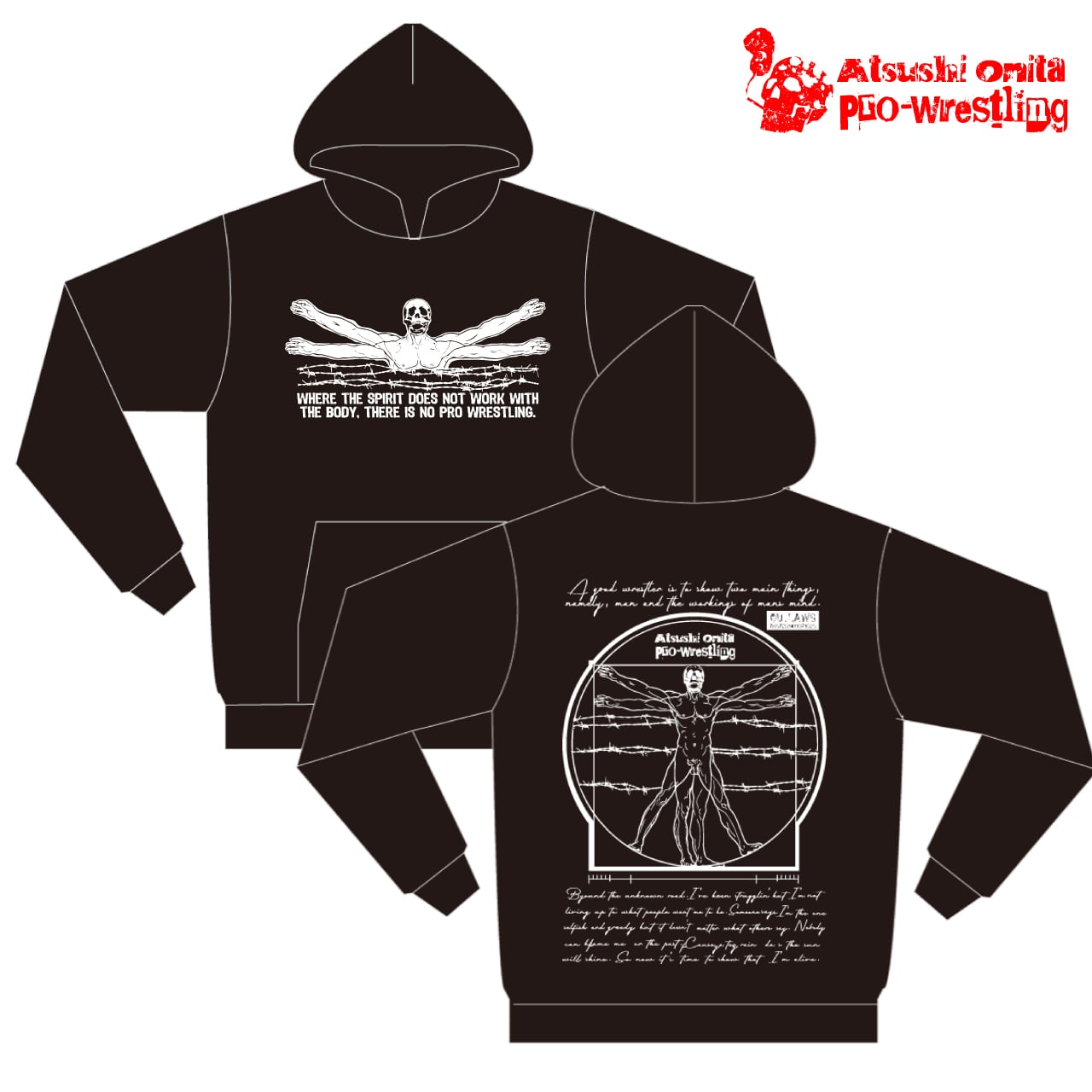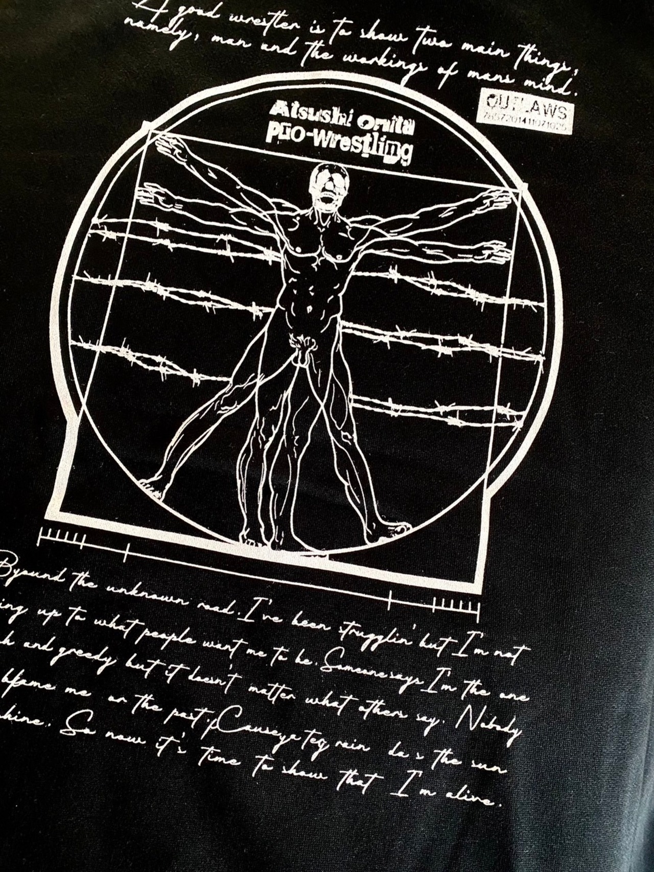 レオナルド・ダ・ヴィンチのウィトルウィウス的人体図への、大仁田厚流オマージュが前面、背面にプリントされています。